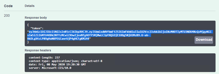 6. In the Window that appears, copy the token value that was generated. Copy only the token value, not the double quotes around it.