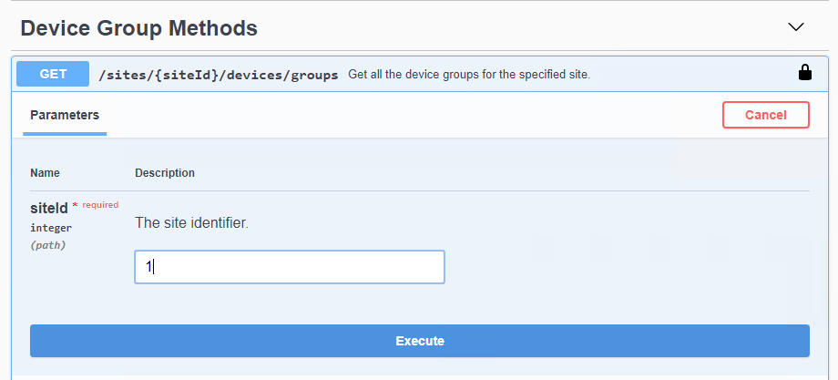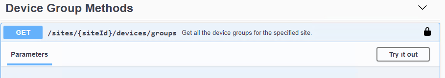 10. Scroll down to find the Device Group methods section and select the GET /sites/{siteId}/devices/groups method.