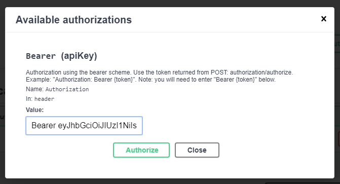 9. In the text box of the window that appears, enter the word "Bearer" followed by the full token and press the Authorize button.